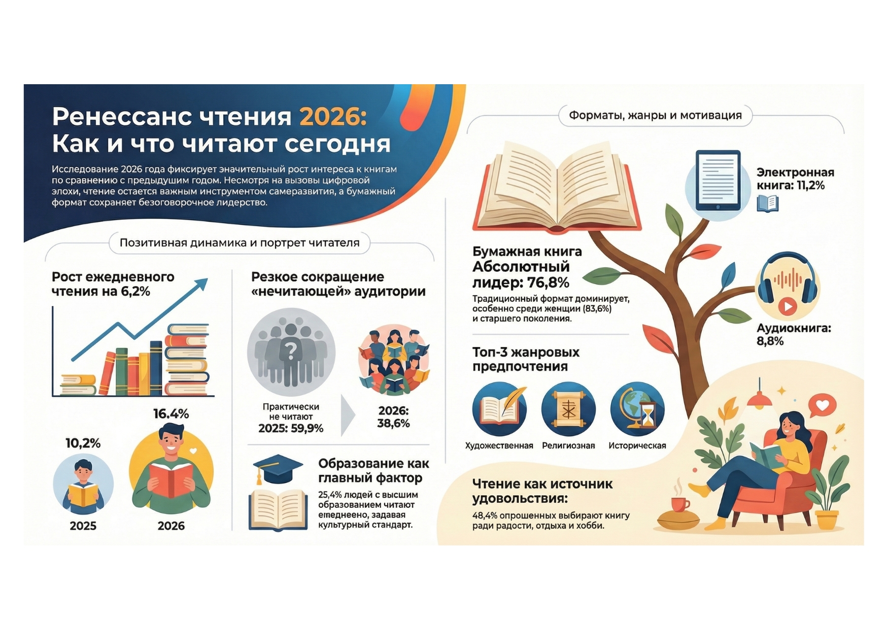 Проведённый опрос общественного мнения выявил положительную тенденцию в динамике читательской активности населения и постепенное восстановление интереса к чтению и расширение группы активных читателей. Мониторинг за 2025–2026 годы показал рост регулярного чтения книг и сокращение доли граждан, практически не обращающихся к чтению. Доля респондентов, читающих книги ежедневно, увеличилась с 10,2% в 2025 году до 16,4% в 2026 году, тогда как доля практически не читающих сократилась с 59,9% до 38,6%.