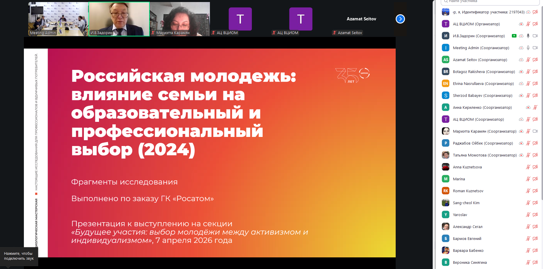 Основной целью семинара стало выявление ключевых факторов, определяющих выбор молодежью моделей социального поведения - от активного участия в общественной жизни до ориентации на индивидуальные стратегии развития, а также выработка рекомендаций по усилению вовлеченности молодежи в процессы общественного развития.